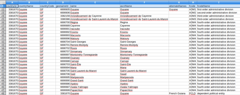1st half of CSV file imported into spreadsheet, records showing admin divisions of Guyane / French Guiana
