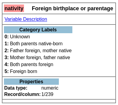 - Column represents our attributes or variables. In this example, it’s: nativity.