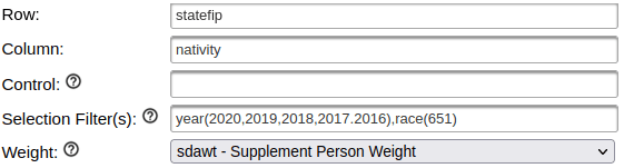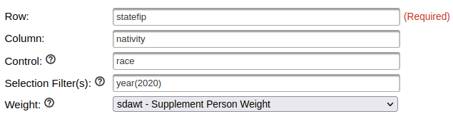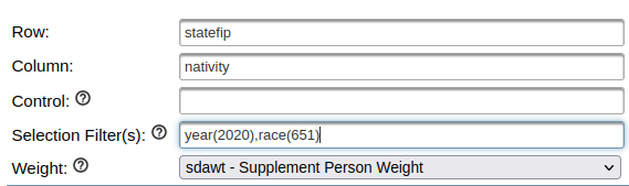 You can also add control variables to a crosstab. For example, if you added sex as a control variable, you would generate separate female and male tables for the nativity by state for the Asian population over a given time period,