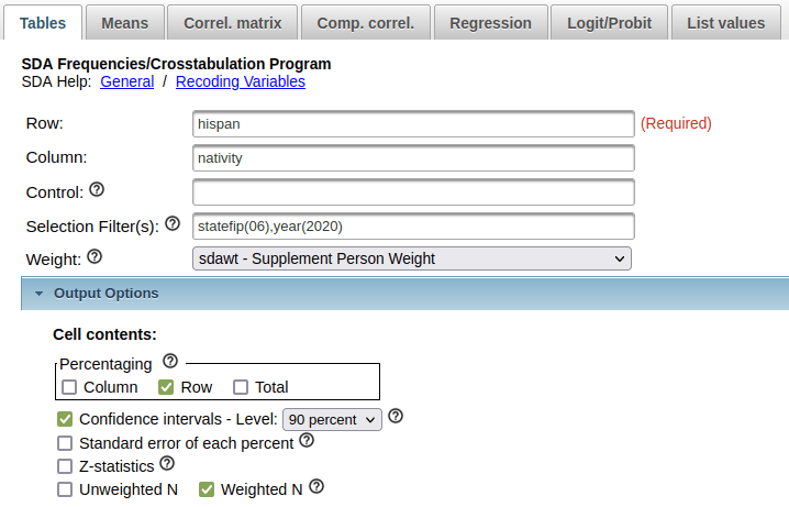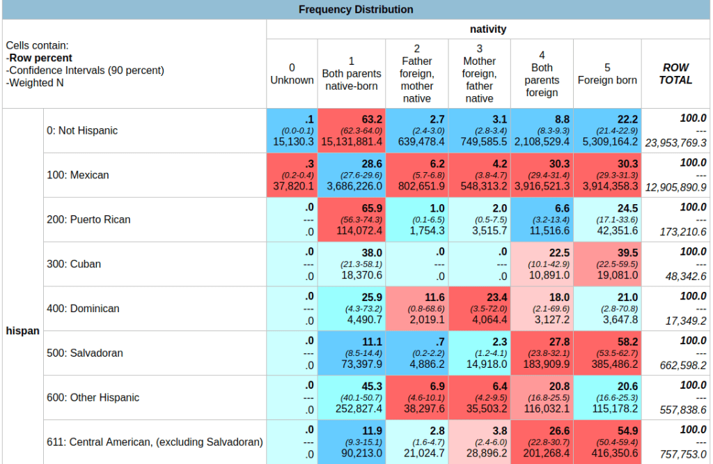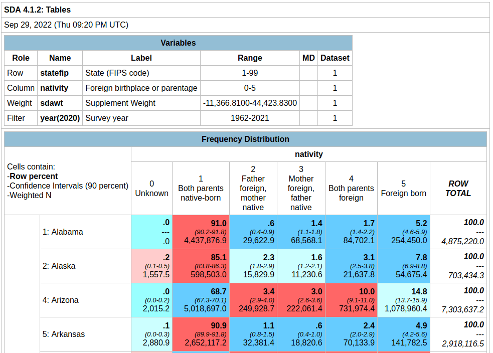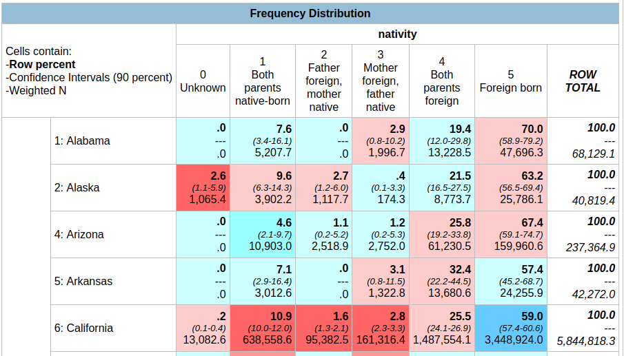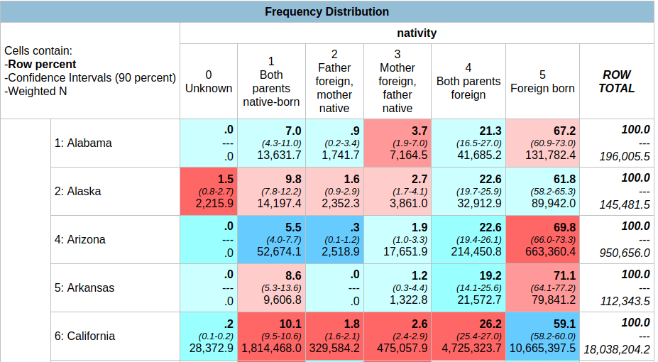 In the result, the summary of your parameters appears at the top, with the table underneath. At the top of the table, the Cells contain legend lists what appears in each of the cells in order. In this example, the row percent is first, in bold. For the first cell in Alabama: 91.0% of the total population have parents who were both born in the US, the confidence interval is 90.2% to 91.8% (and we’re 90% confident that the true value falls within this range), and the large number at the bottom is the estimated number of cases that fall in this category. Since we filtered our observations for one year, this represents the total population in that category for that year (if we check the totals in the last column against published census data, they are roughly equivalent to the total population of each state).