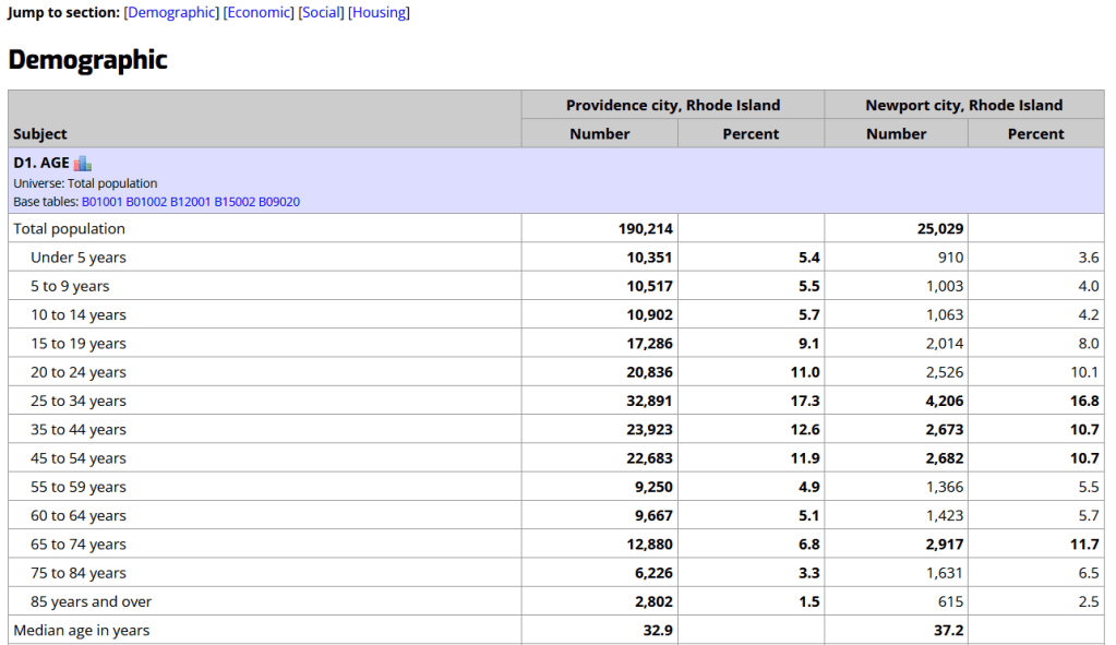Missouri Census Data Center ACS Profiles Showing Data for Providence and Newport, RI