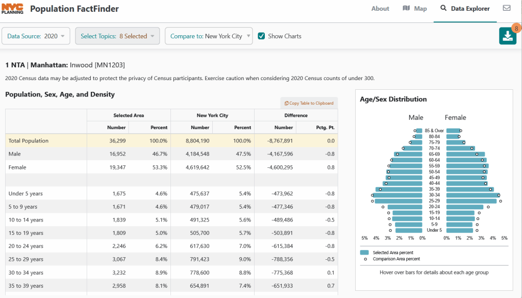 NYC Population Factfinder Showing ACS Data for Inwood in Northern Manhattan