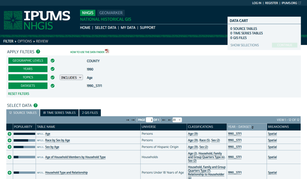IPUMS NHGIS Filtered to Show County Data on Age from the 1990 Census