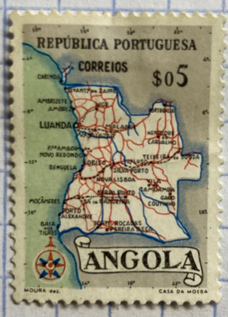 This detailed reference map of Angola was issued as part of a series of stamps in the 1950s, when Angola was a Portuguese colony. The issuance of stamps and depiction of territories was one method for empires to assert authority over their colonies. Visually this is a busy map, as they squeezed in as many cities, roads, railroads, and rivers as they could (emphasizing the development of the colony). The white on grey contrast with a blue halo brings the country to the foreground, and if you look closely you’ll see latitude and longitude coordinates around the edges. Ultimately, too much material squeezed into this little map makes it hard to read.