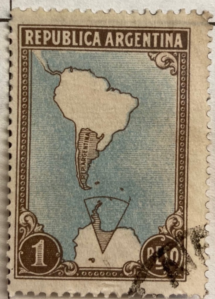 Which is more apparent in this subsequent map from the 1950s. The Falklands Islands (a territory of the UK) are claimed by Argentina and shaded as part of the country in both maps, and in this later stamp so is a big chunk of Antarctica. Nations use maps, and stamps, to assert their authority and control over space, in a message that is affixed to envelopes and sent around the world. A counterpoint to this example is the stamp displayed in the header of this post, a 1971 US stamp commemorating the Antarctic Treaty (which essentially states that no nation can claim or own Antarctica).