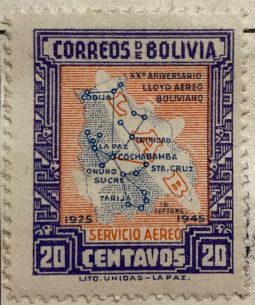 Air travel was often celebrated on mid 20th century stamps, sometimes in relation to air mail services. This compact map of Bolivia from 1945 depicts the seemingly comprehensive system of the national airline within the country, with a vector graph of points and lines, and with labels for the major nodes. The labels and LAB logo fill in and hide areas that don’t have much service, particularly the eastern part of the country. The traditional Mesoamerican motif in the frame is an interesting contrast to the modern subject matter of the map.