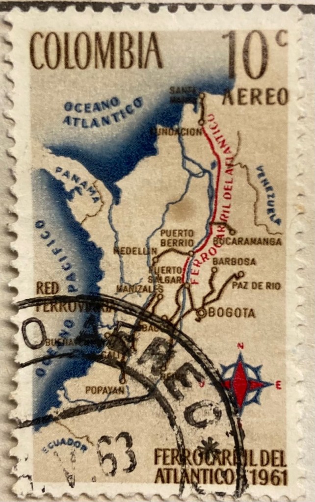 This map of Columbia depicts the Ferrocarril del Atlántico, a railroad line that connects the Atlantic coast to the capital of Bogota and whose construction was quite an achievement. The line is in red, and presumably the brown lines are connecting railroads. The overlapping labels (there are too many of them) make it difficult to read, and the thickness of the lines for railroads, rivers, and country boundaries are the same, making them hard to distinguish. There is no visual hierarchy for the labels to distinguish importance, as the font sizes are all the same, and the labels for the oceans and neighboring countries use the same color, a cartographic no-no. But there is a nice compass rose.