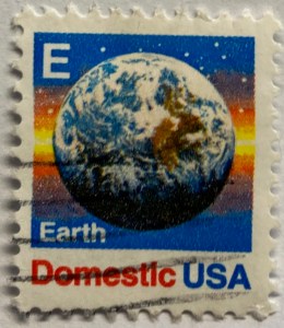 I hope you enjoyed this little, and by no means exhaustive, tour of cartography and geography on postage stamps! There are countless other avenues we could have strolled down in our travels, such as the depiction of explorers and exploration, climate and weather, environmentalism, how map projections are employed, and views from space. My parting example is a reminder that maps are 2D representations of our spherical 3D world. And that “E ” is for “Earth”.