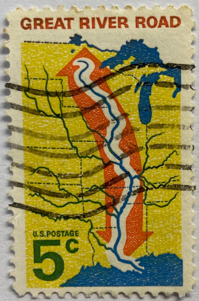 This 1960s map from the US depicts the Mississippi River as the “River Road”. The broad white buffer around the river plants it within the foreground, while the orange arrow imparts a dynamic sense of north / south movement. The tributaries feed into this central trunk, giving us a sense of the breadth of the network. The extent of the map omits the east and west coasts, so we don’t see the overall context for where the river is situated. But it’s a good trade-off, as it focuses our attention squarely on the river system, leaving out the empty spaces that the network doesn’t reach. Still, it would have made sense to indicate that this is the Mississippi River somewhere on the stamp.