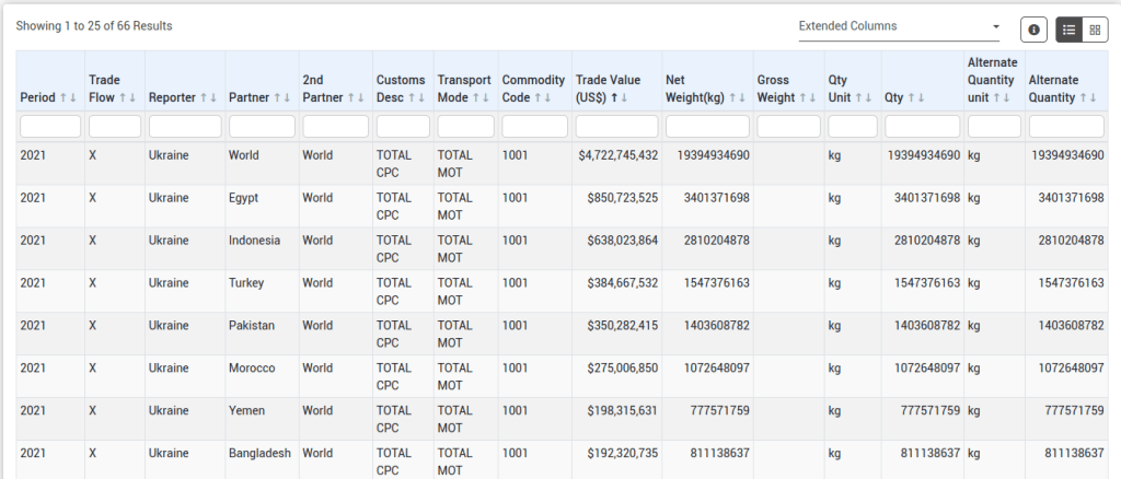 COMTRADE Filtered Results – Exports of Wheat and Meslin from Ukraine 2021