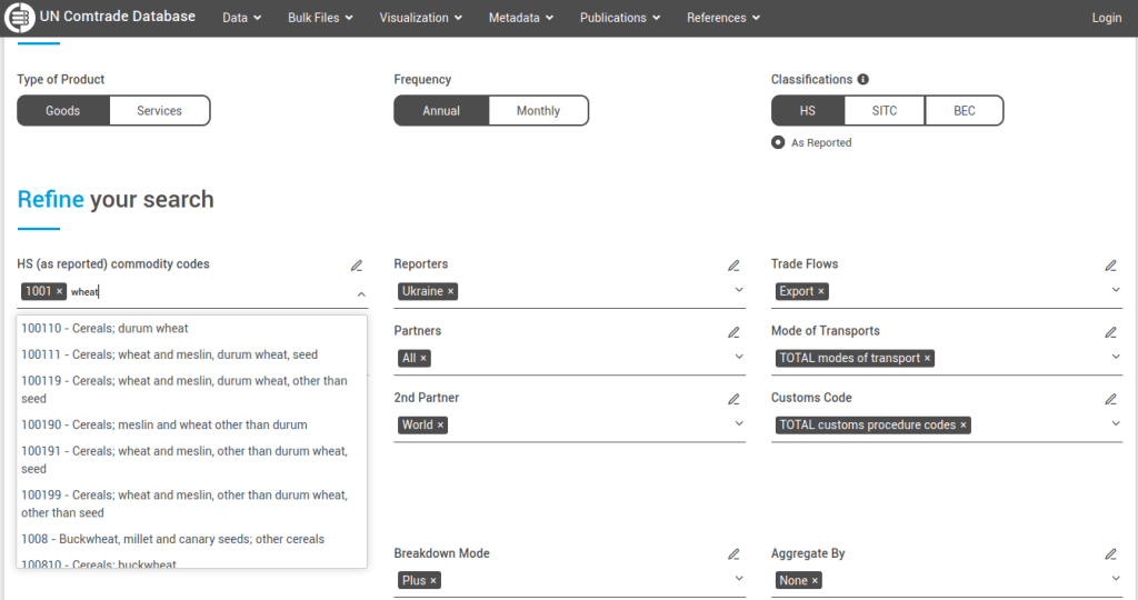 For example, let’s look at annual exports of wheat from Ukraine to other countries. Under the HS filter, remove the TOTAL code. Start typing wheat, and you’ll see various product categories: 6-digit codes are the most specific, while 4-digit codes are broader groups that encapsulate the 6-digit categories. We’ll choose wheat and meslin 1001. We’ll select Ukraine as the Reporter (the country that supplied the statistics and represents the origin point), and for the 1st partner we’ll choose All to get a list of all countries that Ukraine exported wheat to. The 2nd partner country we’ll leave as World (alternatively, you would add specific countries here if you wanted to know if there were intermediary nations between the origin and destination).