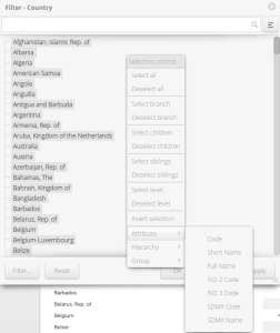 2. Rows allows you to filter out countries or regions that you don’t want to see in the results. You can also change the attribute that is displayed. Once the menu is open, right click in an empty area and choose Attribute. Here you can choose a variant country name, or an ISO country code. ISO codes are commonly used for uniquely identifying countries.