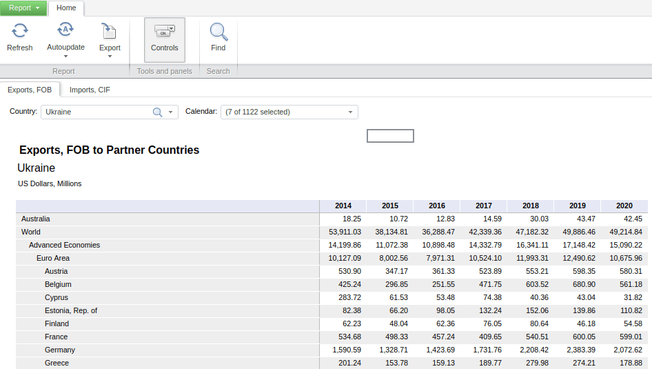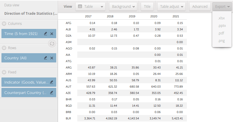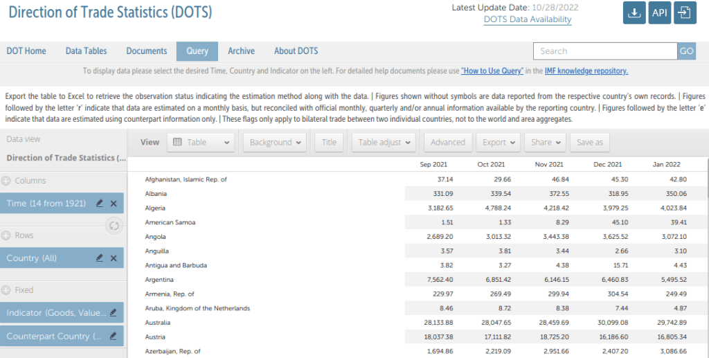 There are a few different ways to browse and search for data. Start with the Data Tables tab at the top, and Exports and Imports by Areas and Countries. The default table displays monthly exports by region and country for the entire world (you could switch to imports by selecting the Imports CIF tab beside the Export sFOB tab). Hitting the Calendar dropdown allows you to change the date range and frequency. Hitting the Country dropdown lets you select a specific region or country. In the example below, I’ve changed the calendar from months to years, and the country to Ukraine. By doing so, the table now depicts the total US dollar value of exports and imports between Ukraine and all other countries. The Export button at the top allows you to save the report in a number of formats, Excel being the most data friendly option.