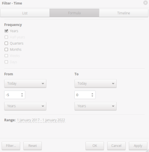 1. Under Columns, select the time frame and interval. For example, check Years for Frequency at the top, and change the dropdowns at the bottom from Months to Years. From -5 to 0 would give you the last five years in ascending order.